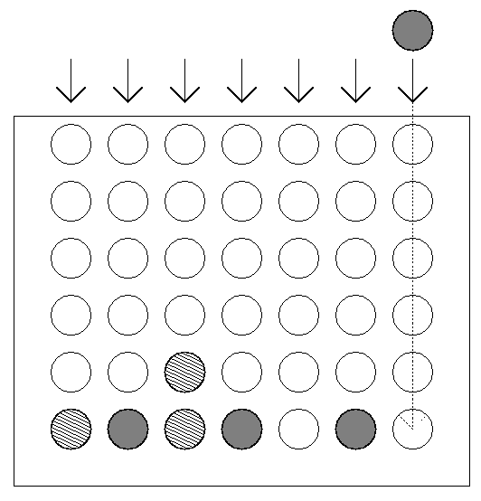Pelilauta on pystyssä ja pelimerkit tiputetaan pelialueen yläreunasta,